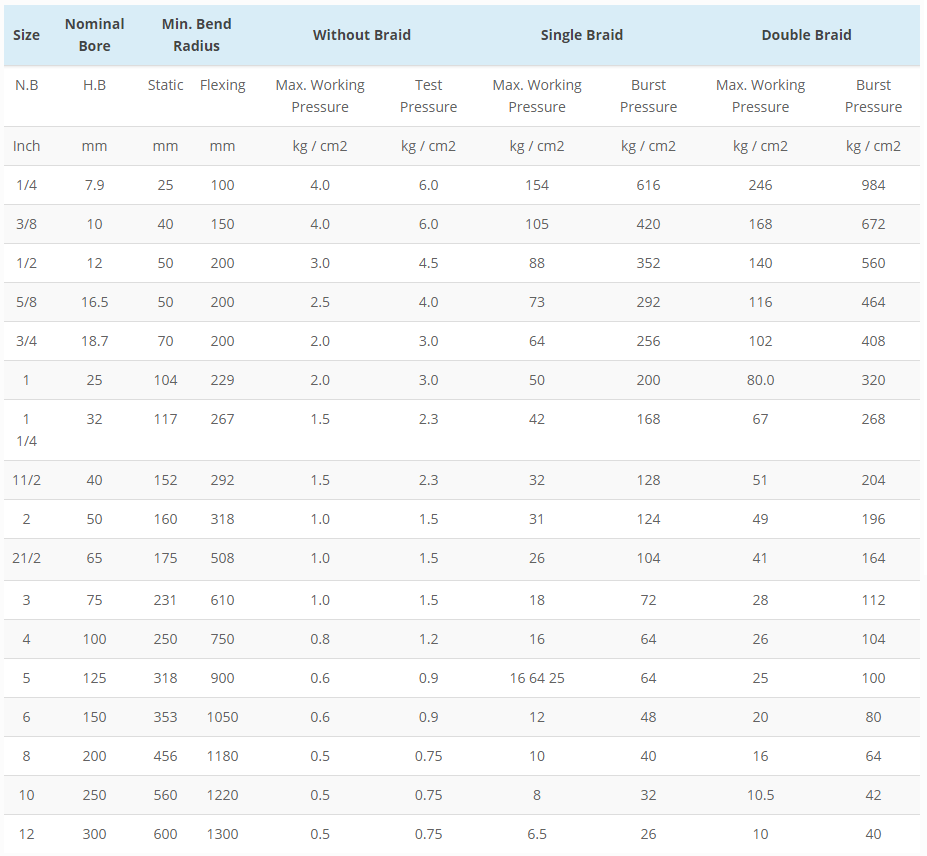 -Test Pressure 1.5 times in working pressure -The above pressure ratings are for fluid and ambient temparature of 30 deg C -The burst pressure in 4 times the maximum working pressure -We also supply hoses with lesser bend radius/ higher pressure rating on request *The above information is subject to change without notice due to continuous development and research.